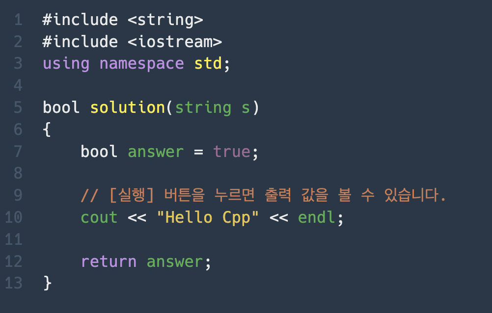 참과 거짓을 나타내는 데이터 타입인 boolean을 사용하여 문자열 s를 선언